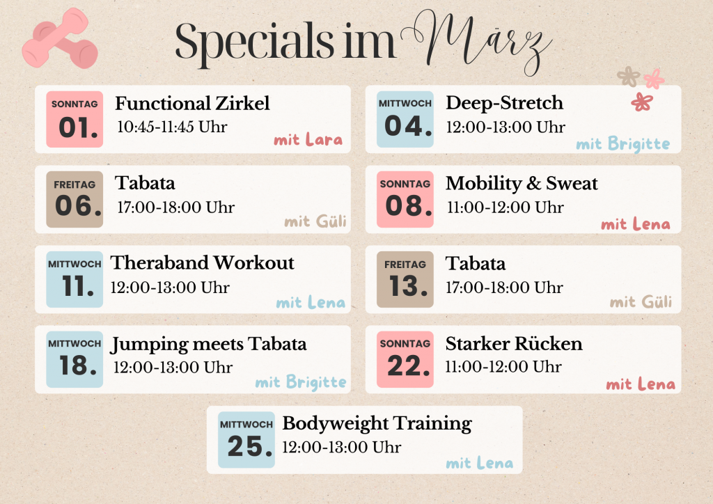 Samstags finden unsere therapeutischen Kurse mit einer Gebühr von 4,00€ statt, jeweils von 11:00-12:00 Uhr: